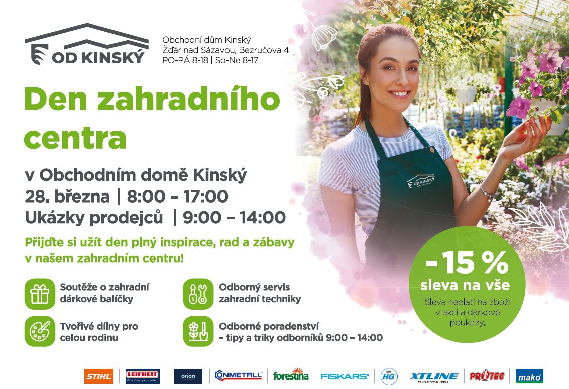 Připravte se na jaro u nás v Obchodním domě Kinský. Po celý den 28. března pro vás bude připravena nabídka za akční slevu -15% na vše.